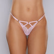 Bondage inspired strappy panty with naughty ring details, and scalloped lace. Lace front and back with silver ring details. Adjustable waist straps.Sizing Info - O/S: Waist: 26-30 in. Low Waist: 28.5-32.5 in. Hip: 36-40 in.