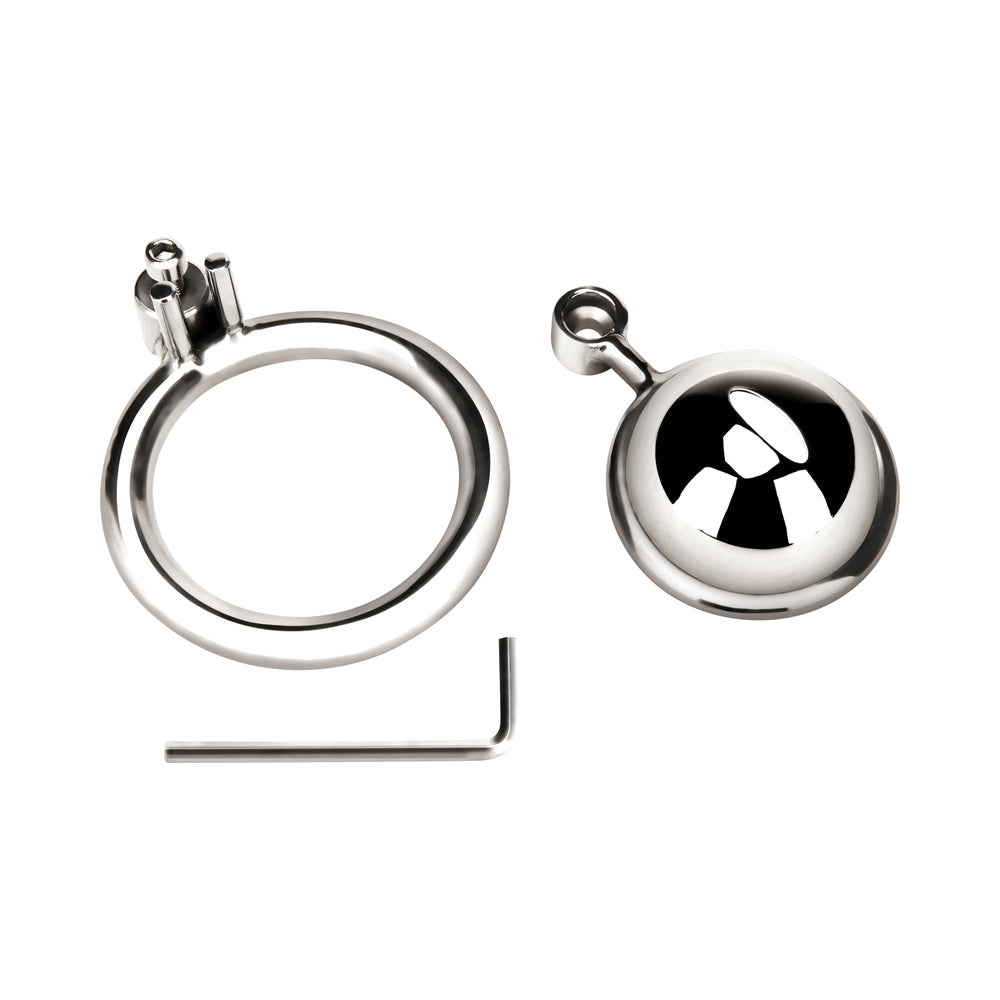 Discover the ultimate chastity experience with this Blue Line cock cage style. Crafted from firm stainless steel, this unique device firmly embraces the wearer's member, leaving no room for movement. The rounded top of the cage evens out the penis head while ensuring breathability and comfortable long-term wear through a strategically placed opening. Its 2-piece design offers effortless assembly and disassembly, granting you versatile control over your chastity play. Hygiene is a breeze with easy-to-clean materials, making this cage ideal for prolonged wear. Whether for daily kink or discreet pleasure, this cock cage lets you explore chastity with confidence and style. Easy to attach 2-piece set Includes a hex key for locking in place Made of body-safe metal Material: Stainless steelItem Length: 1.5 in.Item Width: 2.4 in.Item Height: 2.87 in.