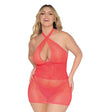 Stretch fishnet & scalloped stretch-lace chemise featuring: Criss-cross halter neckline with keyhole detail Adjustable back neck ties Open back with spanking skirt detail Iridescent metal ring accent Matching G-string included