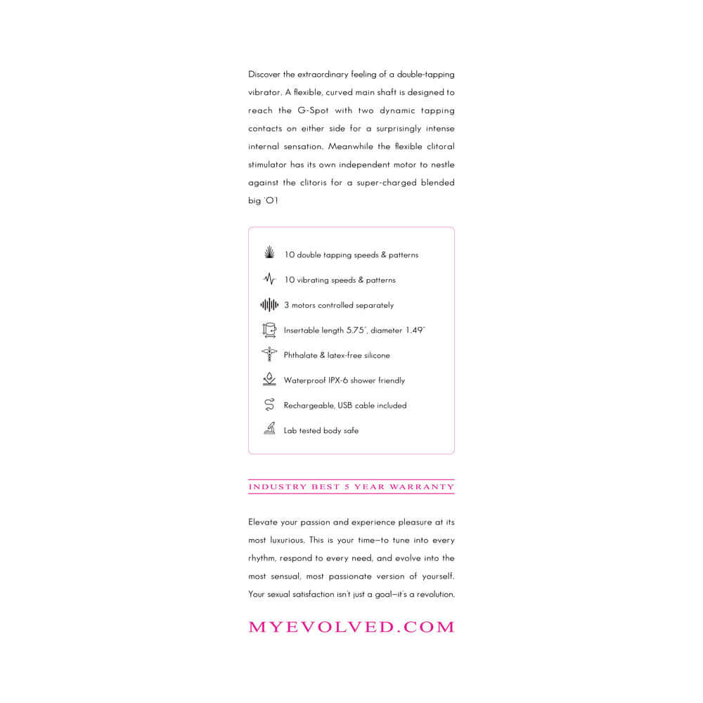 Experience new depths of ecstasy with the Evolved G Tapper G-spot Clitoral Stimulation, a dual-motor vibrator that redefines blended pleasure. Designed with a flexible, curved shaft, this luxury massager reaches your G-Spot effortlessly while two dynamic tapping contacts on either side deliver an extraordinary internal sensation that feels unlike anything else.