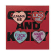 Four 3/4in. hard enamel heart pins on one card.Pins read: Spank Me, Lick Me, Fuck Me, Make Me Cum.
