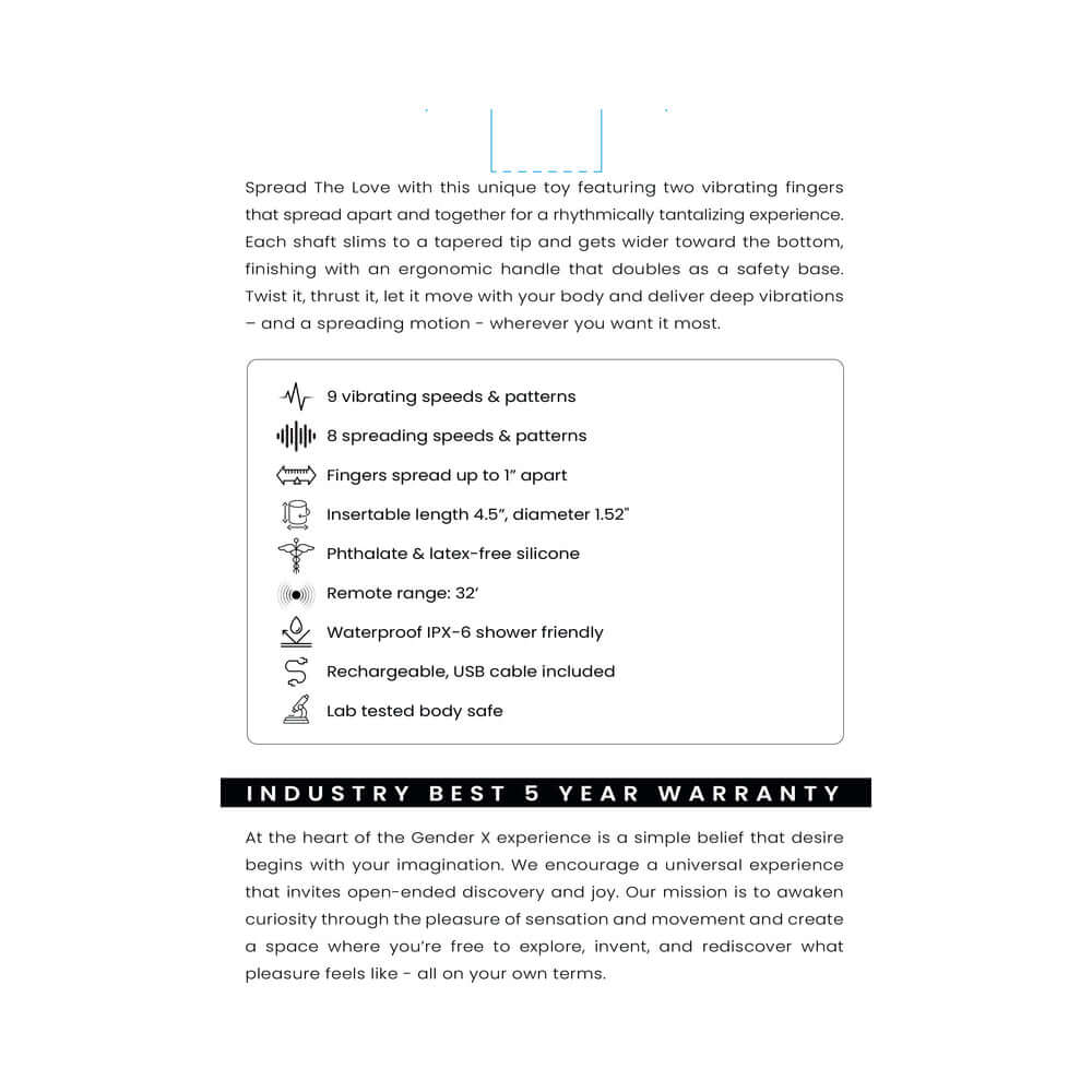 With 9 vibration speeds and 8 spreading patterns, you can customize every sensation—from gentle teasing to intense pulsations. Each flexible finger tapers to a smooth tip for easy insertion, widening toward the base for a secure, comfortable fit. The ergonomic handle doubles as a safety base and grip for better maneuverability during use. Crafted from phthalate- and latex-free silicone, the Gender X Spread The Love Prostate Massager Black is body-safe, waterproof (IPX6 shower friendly), and USB rechargeable.