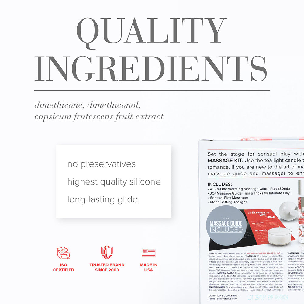 JO All-In-One Massage Kit includes everything you need to set the mood for an enticing night of sensual foreplay or relaxing intimacy. Spread our premium All-In-One Warm Embrace Sensual Massage Glide across your partner's skin and experience a gentle warming sensation that arouses and enraptures you both. Then enjoy some skin to skin or use our perfectly shaped Sensual Play Massager - also included - to smooth out all the tension and explore every inch of pleasure. Includes Highest Quality Silicones Long-Lasting Glide Preservative-Free Buttery Feel Never Sticky or Tacky Not Compatible with Polyurethane Condoms Compatible with Most Toys and Condoms Made in the USA FDA Licensed ISO Certified 100% Pleasure Guarantee Ingredients: Dimethicone, Dimethiconol, Capsicum Frutescens Fruit Extract