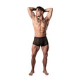 From the Show Stopper collection by Male Power, the Mini Short with low cut waist, high cut legs, and open hips with plush elastic straps adorned with ornamental tunnel beading.Superfine Micro Mesh embedded with silver dots and adorned with silver toned beading on plush elastic strapping.90% Polymide, 10% Spandex