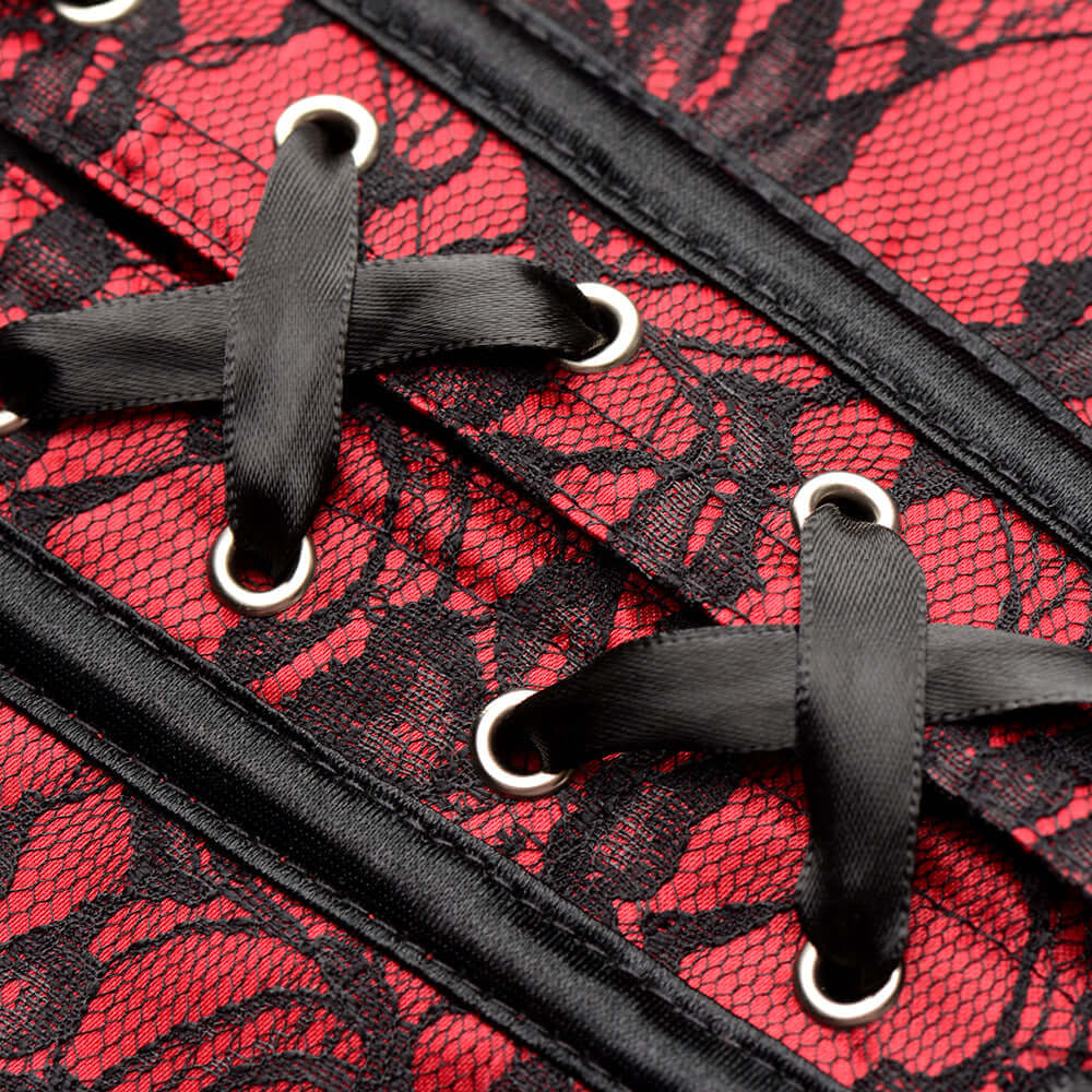 Indulge in this scarlet corset and thong and really embrace your seductive and sensual side! The corset is made out of polyester and spandex with steel boning and busk closures. The boning helps reinforce the structure and look of an hourglass shape while supporting you and your bosom or chest. The polyester corset is made up of scarlet fabric with black lace over it and black ribbons and ruffles that enhance the look and feel overall. The classic lace-up back gives you a custom fit and feel with smooth, silky ribbons that match the ruffles on the corset.Slip into something sexy tonight! Step into the G-string and then grab the corset. Loosen the lace in the back as much as possible without undoing the cross threads, then open the corset up and wrap it around you so that the metal busk closures are on the front side. Start from the bottom and hook one busk closure at a time, slowly moving your way up until they are all hooked on and closed. Then, start to tighten the laces behind you. If you've got a friend or lover, ask them for help! If your love enjoys lacing you up, present your back to them and let them slowly tighten the corset until you feel a constriction around your waist and chest. You may be a little short of breath if it's worn very tight.A fully tightened corset will cause you to stand upright with poise and good posture, may cause shallow breathing, and will push up your bosom! However, it's also sexy to wear it looser so you can move and breathe. Pair this with a bustle skirt, a pair of skin-tight pants, a miniskirt or simply wear nothing except the G-string, some stockings and heels for a pin-up look! Lace Up Back: Tighten your corset for a custom fit with this classic lace-up back made of polyester ribbons. Flexible Boning: The flexible, steel boning helps reinforce the shape and structure of the corset for a comfortable and form-flattering fit. Metal Busk Front Closure: Lock your corset into place at the front with the steel, busk front closures. Matching G-String: Match the top the the bottom with the matching G-string panty bottoms! Measurements: Chest: 37.5 - 39.5 inches, Waist: 28 - 29.5 inches Materials: Polyester, Spandex, steel Note: Panty size is 'One Size Fits Most'.