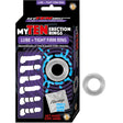 Ten cockrings, individually packed for travel, are made of super stretchy TPE and are waterproof. Outer diameter is 1.375 in.; inner diameter is 0.625 in. Water-based lube included.