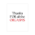 Express your gratitude in a cheeky and bold way with our Thanks for all the Orgasms card! This straightforward and humorous card is a perfect cheeky thank-you to a partner who knows exactly how to keep the sparks flying. It's a unique way to celebrate your intimate moments together, perfect for an anniversary, Valentine's Day, or any special occasion that calls for a little extra sass and a lot of love.Design Details: Front Message: Thanks for all the Orgasms Inside Message: (Blank Inside) Size: 4.25 x 5.5 in. Includes: Greeting Card, Envelope, Plastic Wrap