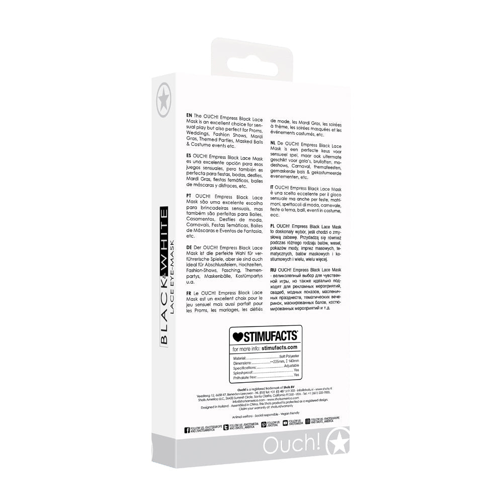 Ouch! Black & White Empress Lace Eye Mask Black is backordered and will ship as soon as it is back in stock.