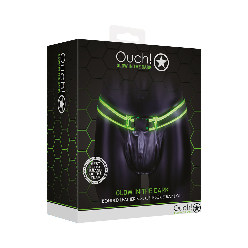 Ouch! Glow in the Dark Bonded Leather Buckle Jock Strap Neon Green L/XL