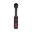 Ouch! Paddle - LOVE - Black. Leave a lasting impression on your sub. The word LOVE is reversed so it will show up on their skin. Made of firm but flexible stitched leather.
