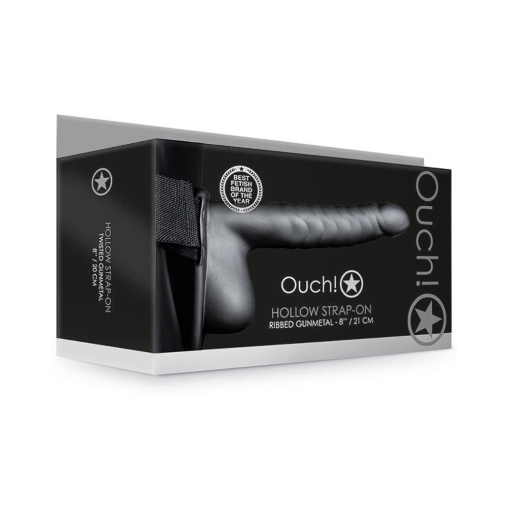 Ouch! Ribbed 8 inches Hollow Strap-On with Balls Gunmetal