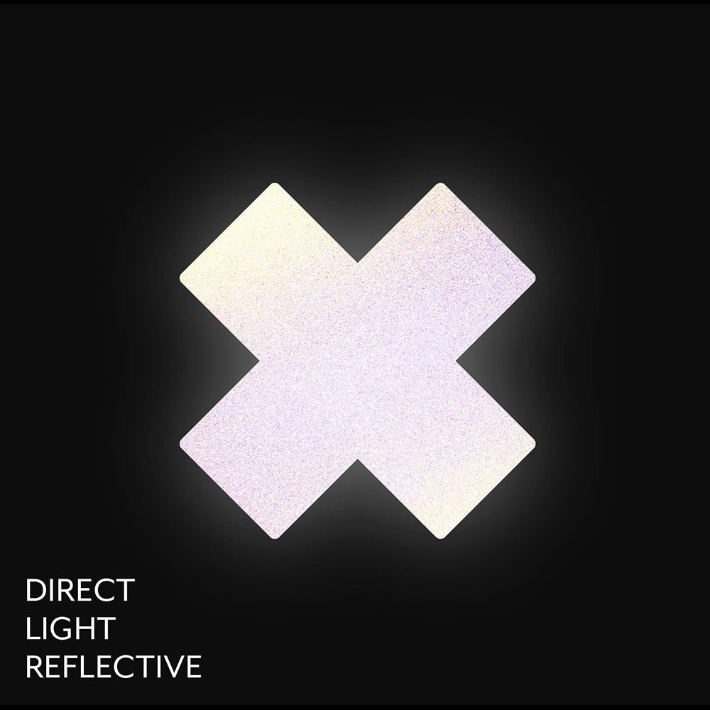 Plus X: Reflective Cross Nipple Pasties by Pastease are hand-made in the USA of form-fitting road-sign-like reflective material that forms seamlessly to curves and resists wrinkling over hardening nipples.Just peel-and-stick on clean, dry skin. All Pastease feature latex-free, medical-grade, waterproof adhesive that stay securely in place for as long as you like and until they are gently removed.Conceal or Reveal with Pastease nipple pasties when worn with a sexy outfit, daring bikini, sheer top, revealing dress, Hefty bag, body lotion, crazy costume, party theme or nothing at all!Dimensions: 3 x 3 inches. Coverage Diameter: 1.6 inches.Bright and colorful, road-sign-like reflective reaction to light makes your futuristic Reflective Pastease POP!All Pastease products are hand-made, so the finished product you receive may vary slightly from the posted image. Go get your Sexy Fun Freedom On! X™¥X™¥ Pastease!