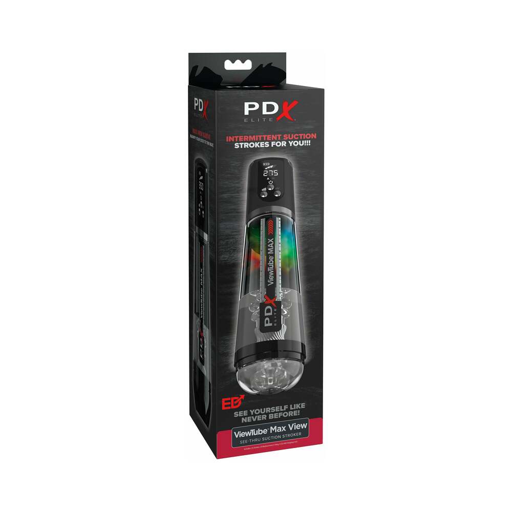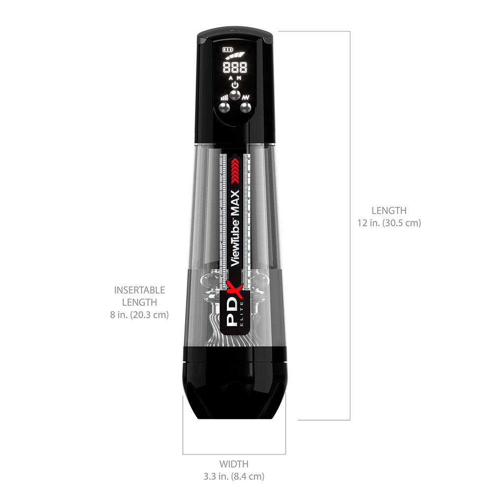 The PDX ELITE VIEWTUBE MAX VIEW elevates masturbation with powerful intermittent sucking for the ultimate stroker experience. It's a perfect storm of sensation for heightened solo sex sessions that can be customized to your personal moods! Get ready for explosive push-button cock-sucking, surrounding your penis with ultra-soft automatic sucking action! So what are you waiting for...Stick it in and view your cock magnifying to the MAX! Intermittent SUCTION Technology: The ultra-strong motor provides 4 patterns of pleasurable suction modes. Intermittent sucking automatically sucks your penis into the ultra-soft sleeve for pleasures beyond your wildest dreams! Personalize Your Suction: Enjoy 4 modes of automatic intermittent suction patterns, or manually control the suction patterns yourself! Increase the suction pressure to maximize stimulation to your penis, to tease and please! Ultra-Soft Sleeve: The extraordinary feel of the ultra-soft sleeve caresses your penis with every suck from the powerful motor. The unique texture wraps around your entire shaft while the ViewTube Max View automatically strokes and vibrates for mind-blowing stimulation! Viewtube €“ Max view Sleeve: See yourself like never before! Stick it in and view your cock magnified to the max! Illuminated LED lights: Add to the fun and watch your manhood get showered with an array of colored lights as you get stroked and sucked! USB Magnetic Recharging: Ready when you are! Easily and conveniently rechargeable with included magnetic charging cord, offering hours of enjoyment. Specifications: Materials: ABS Plastic, Polycarbonate, and TPE Item Length: 12.0 in. (30.5 cm) Item Width: 3.3 in. (20.3 cm) Item Weight: 1.4 lbs. (0.6 kg) Special Features: Splashproof, Suction IPX Rating: IPX6 Modes: 4 Suction Modes, 4 Patterns Warranty Period: 1-Year Limited Warranty Battery Type: Rechargeable Charge Time: 2.5 hrs. mins. Charger Type: Magnetic/USB-A Package Includes: (1) Stroker, (1) Replacement O-Ring, and (1) USB Charging Cord, (1) Printed Instruction Manual Included