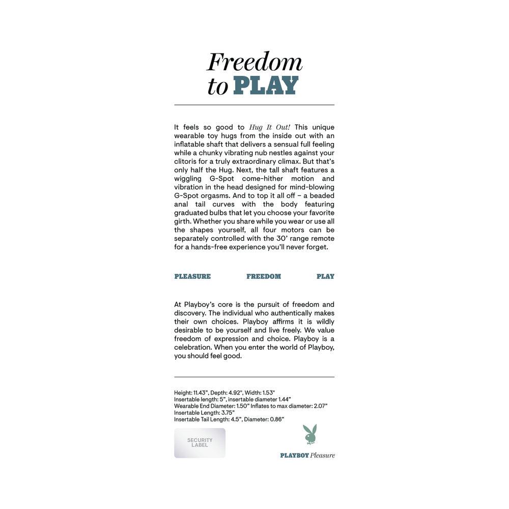 It feels so good to Playboy Pleasure Hug It Out Acai Massager — the ultimate triple-stimulation toy designed to embrace your body from the inside out. The Playboy Pleasure Hug It Out Acai Massager delivers full-body satisfaction through an inflatable internal shaft, wiggling G-spot motion, powerful vibrations, and a beaded anal tail for total stimulation.