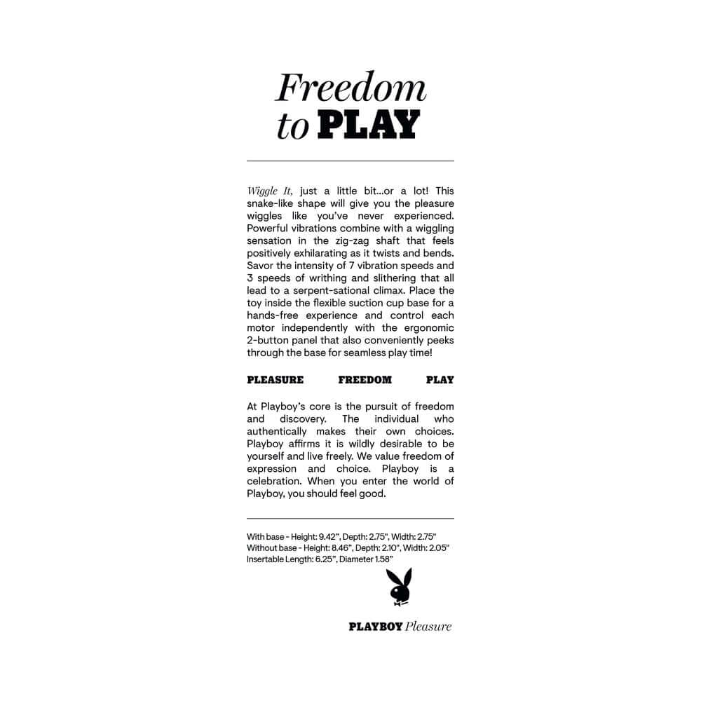 Twist, pulse, and wiggle your way to bliss with the Playboy Wiggle It Vibrator Acai—a serpent-sational experience designed to move with your every desire.