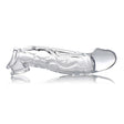 in.This extender sleeve gives you two whole inches of solid penis to plow into your partner! The realistic texture, featuring a bulbous head and bulging veins, along with a subtle curved shape will deliver a new kind of internal massage. Just lube up and put your entire package through the first hole, allowing your scrotum to go through the bottom hole for a satisfying stretch. The solid 2 inch tip is followed by a hollow interior that allows for a snug and secure fit. This body-safe and phthalate-free material is compatible with silicone and water-based lubricants. Use warm water and mild soap or a toy cleaner to clean after use. Measurements: 9 inches in total length, 6.25 inches insertable. Interior diameter is 1.2 inches, exterior diameter is 2 inches. Penis and scrotum hole is 1.5 inches in diameter, scrotum hole is 1 inch in diameter. Material: TPR. Color: Clear.in. @npc2019_26