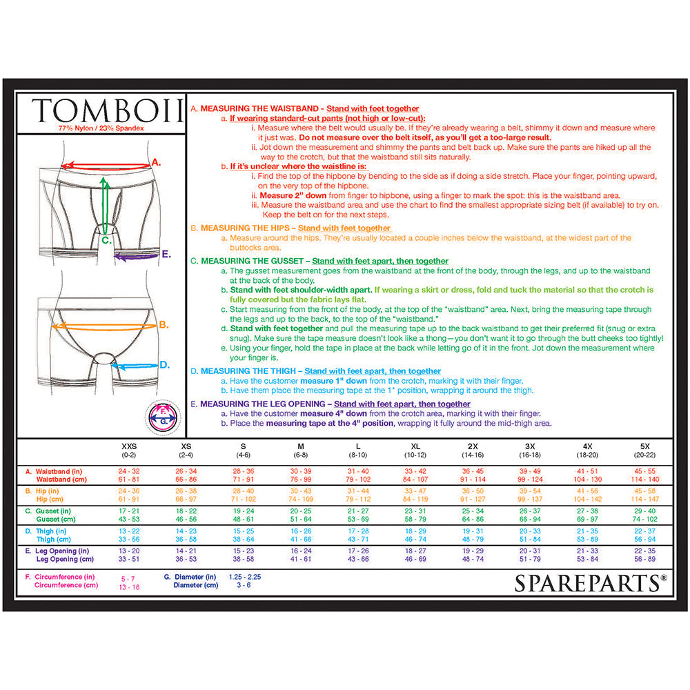 Bold attitude with an athletic cut, Tomboi and Tomboii harness briefs deliver a smooth shot of sex appeal and cut right to the chase: let's do this. Both versions slide on and off smoothly, without any chafing buckles, dangling straps, pinched skin, or other baggage to get in the way. To say they are thoughtfully designed is an understatement. Available in 2 fabric choices: nylon and rayon.Tomboii includes: 3 pockets for bullets 2 holes for varied angles or double penetration Internal packing strap for pack and play Condom pouch 77% Nylon, 23% Spandex Waistband 26 - 34in. Hip 26 - 38in. Gusset 18 - 22in. Thigh 14 - 23in. Leg Opening 14 - 21in. O-ring circumference 5 - 7in. O-ring diameter 1.25 - 2.25in.
