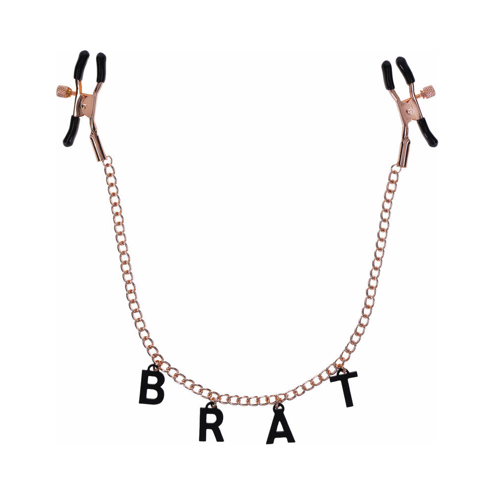 Embrace your brattiest attributes and proudly display your naughtiness with the Brat Charmed Nipple Clamps! Adjust the tension and explore pleasure at every intensity with the rubber tipped, rose gold chained nipple clamps. Own every teasing quality you love with the black charms stretched across the chain labelling you for what you love to be, a in.BRATin.! Dual sided adjustable tension rubber tipped nipple clamps Enticing black lettering spelling 'BRAT' 17.5in. rose gold chain Materials: 50% Iron alloy, 45% Zinc alloy, 5% PVCPackaging type: BoxPackaging: 5.25in. H x 8in. W x 0.75in. D
