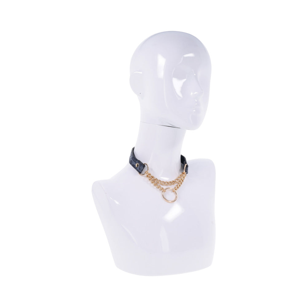 This elegant piece, crafted from animal-printed faux leather, is adorned with subtle gold hardware, making it a stylish accessory for any occasion. The gold ring that hangs from your neck can be used for playful tugs or to attach a leash, adding an extra layer of excitement to your encounters. Wear it as a bold statement or a discreet symbol of your wild side, and let your inner feline shine. Leaves a paw impression Fixed chain for faux-choking play Gold hardware chain and 1.25 in. ring Fits necks 15 in. to 17 in.