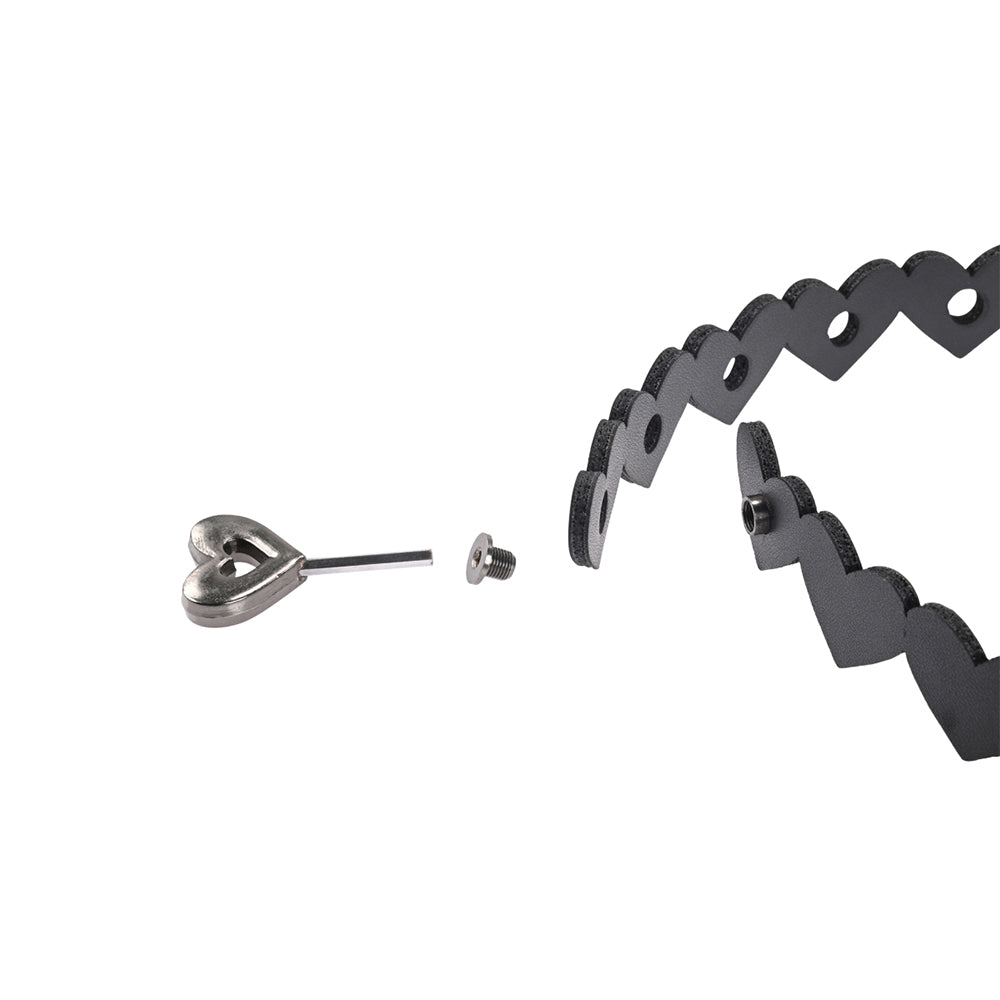 Turn up the heat with the Heart Day Collar and add a touch of mystery and seduction to your everyday look. Crafted from sumptuous faux leather, this choker style necklace is designed with connected hearts and can be locked in place for ultimate control and submission. Whether you're looking to spice things up in the bedroom or simply add a hint of naughtiness to your daily style, the Heart Day Collar is sure to capture attention and leave them wanting more. So go ahead and indulge in a little flirtatious fun - you know you want to!Features Custom heart-hex key locks collar in place Supple faux leather allows for comfortable all day wear Adjustable length to fit necks 15in. to 19in. Includes:One Custom Heart Hex KeyOne PU Heart Necklace StrapOne Hex Bolt and Threaded NutMaterials: 80% PU, 10% Zinc alloy, 5% Iron, 5% CopperDimensions:Packaging type: Hang CardPackaging: 5.25in. H x 8in. W