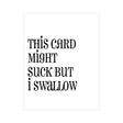 Introducing the This Card Might Suck But I Swallow greeting card, a humorous and self-aware option for your customers looking for an ice-breaker or a light-hearted way to acknowledge life's imperfections.The simple and clean design of this card with its bold, black font makes it versatile for various occasions or just a quirky note to a loved one. Made with high-quality card stock to ensure a smooth writing surface and a professional look, this card is sure to be a hit for those who appreciate a bit of dry humor.Design Details: Front Message: This Card Might Suck But I Swallow Inside Message: (Blank Inside) Size: 4.25 x 5.5 in. Includes: Greeting Card, Envelope, Plastic Wrap